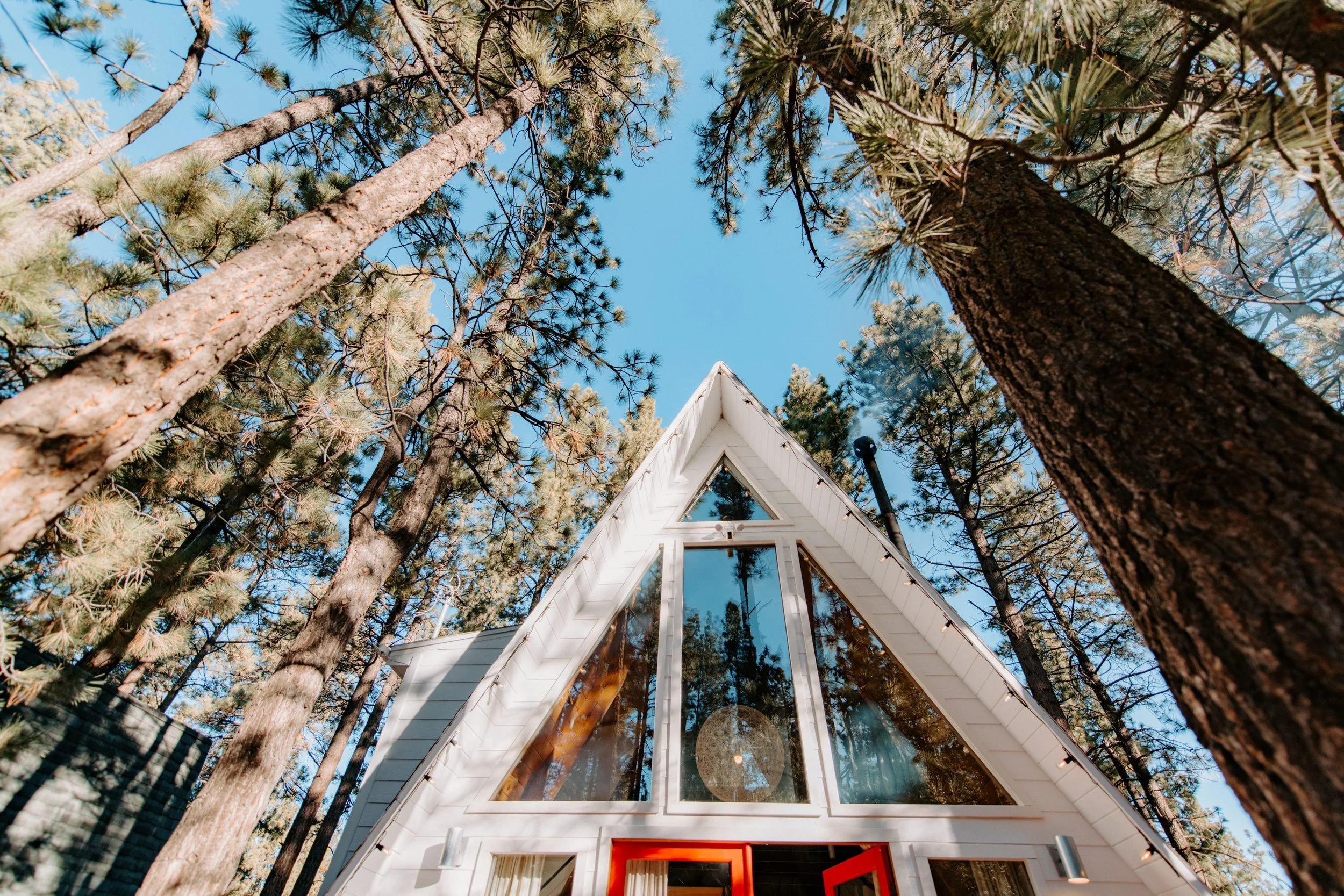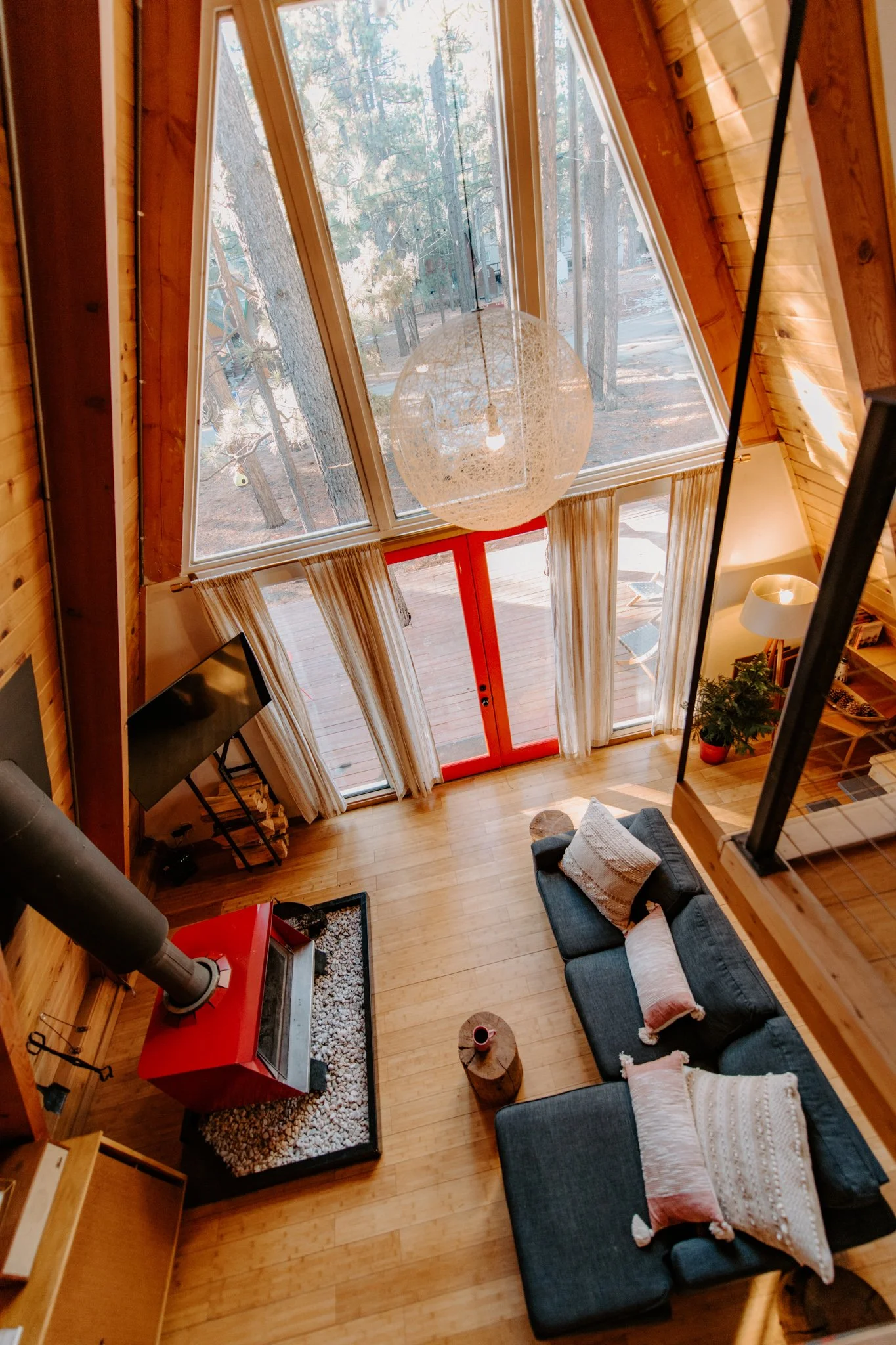 As seen on Condé Nast Traveler, our 1963 A-frame cabin in the woods has been re-imagined and up-cycled while keeping its mid-century soul. Located in a grove of 21 pine trees on a 5,000 sq. ft lot, its vintage A-frame design provides seclusion + privacy on a quiet street.